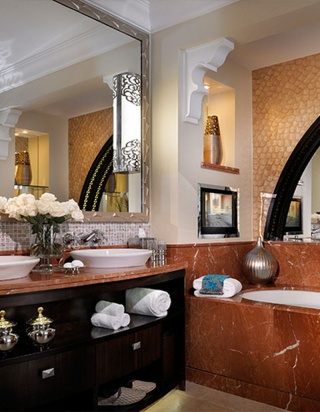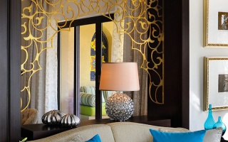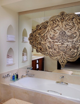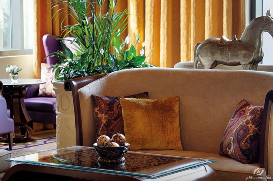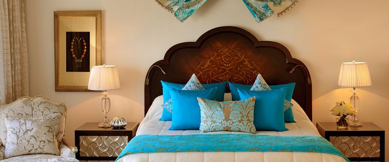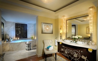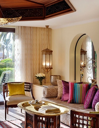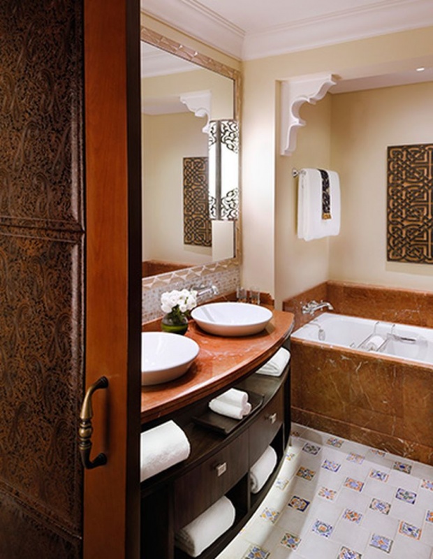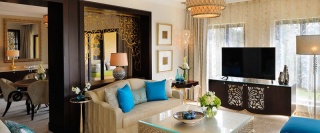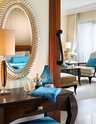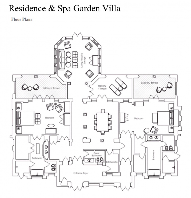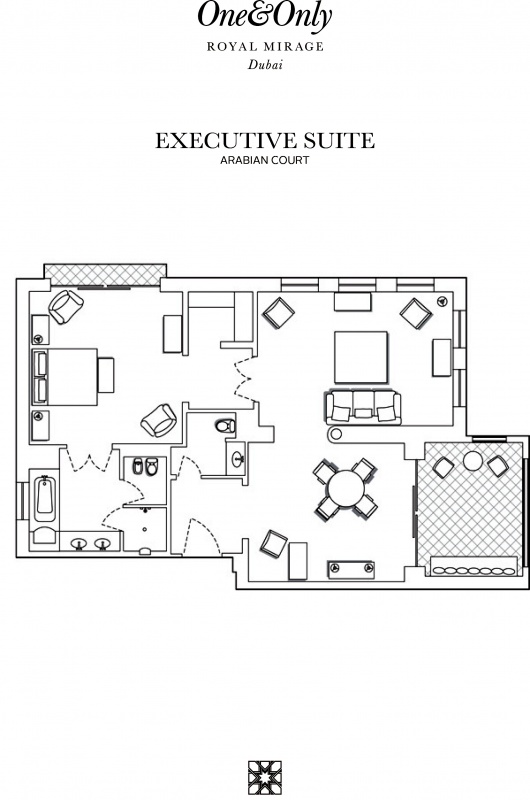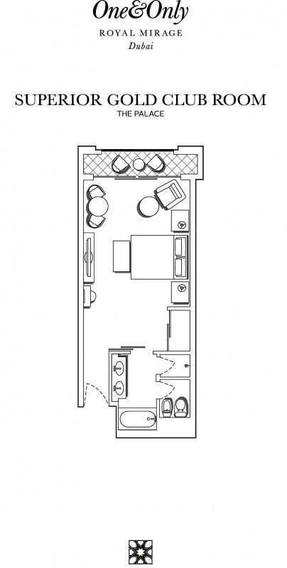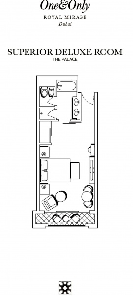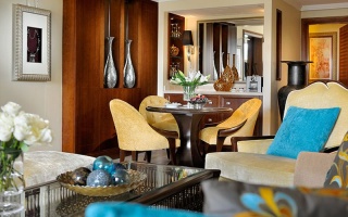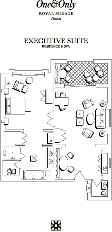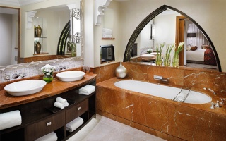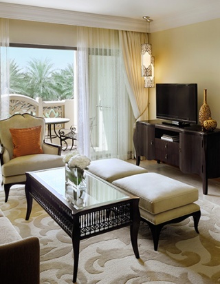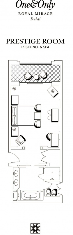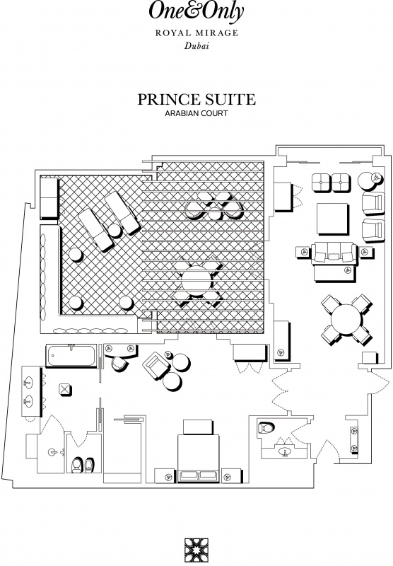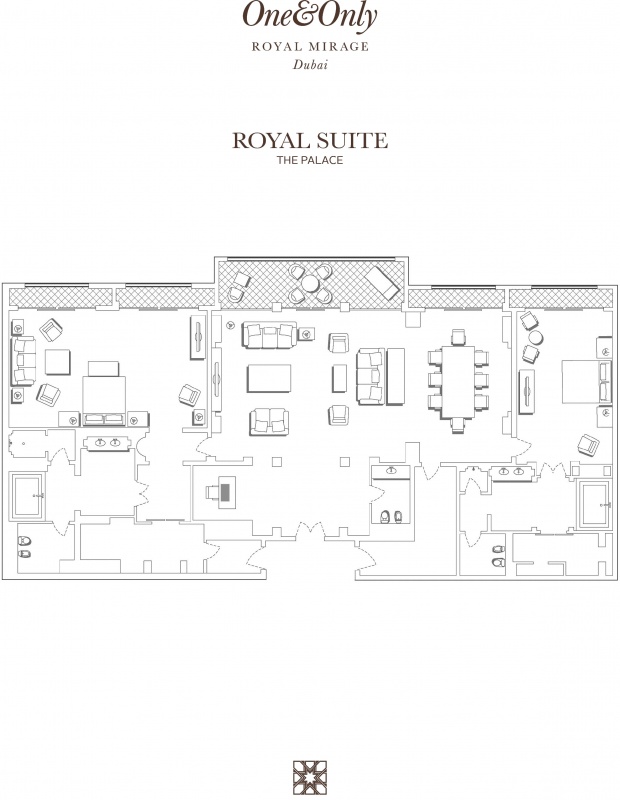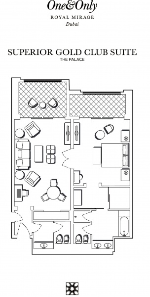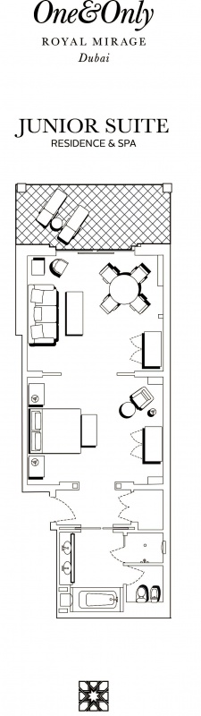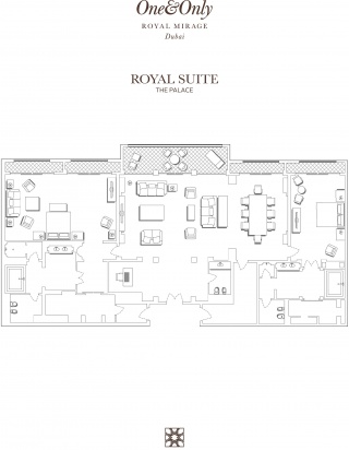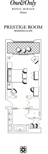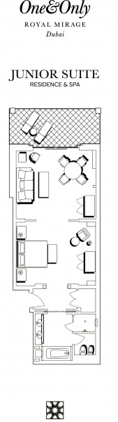 Роскошно оформлен в стиле Аравийской магии, состоит из фойе, спальни, гостиной Maijlis в восточном стиле со столовой зоной, большой ванной комнаты, отделанной мрамором, гранитом и деревом, гостевой туалетной комнаты, просторной меблированной террасы (25 кв.м) на которой стоят удобные кушетки в стиле Majlis, обеденный стол, кресла и два шезлонга, с видом