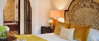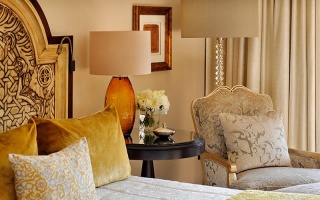 Большие двуспальные кровати King Size из натурального дерева в номерах люкс установлены на возвышении, отделяющем спальную зону от уютной гостиной в стиле меджлиса. В номере имеется отдельный обеденный стол, который также может использоваться и для работы.